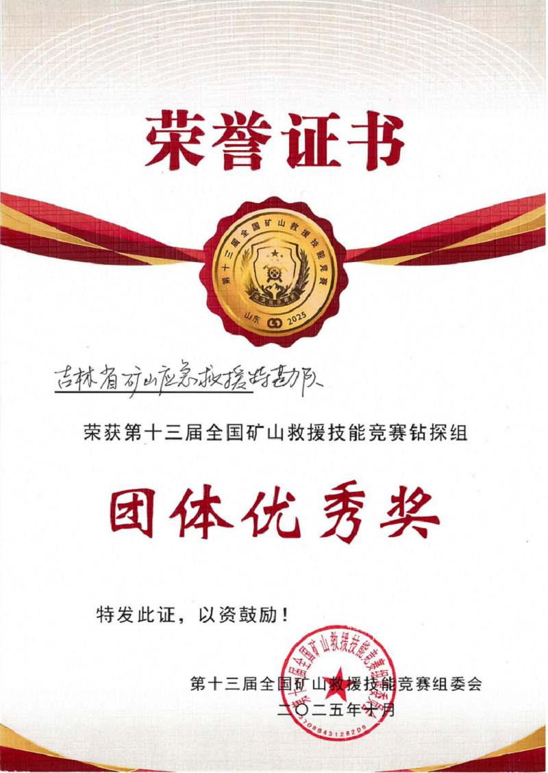 10月14日至17日,由应急管理部、全国总工会、共青团中央、国家矿山安全监察局、山东省人民政府联合主办的第十三届全国矿山救援技能竞赛在山东济宁隆重举行。代表吉林省参赛的省地矿勘察设计研究院团队在钻探组竞赛中表现突出,荣获团体优秀奖,李宝、任大亮两名同志更凭借出色发挥斩获个人三等奖。