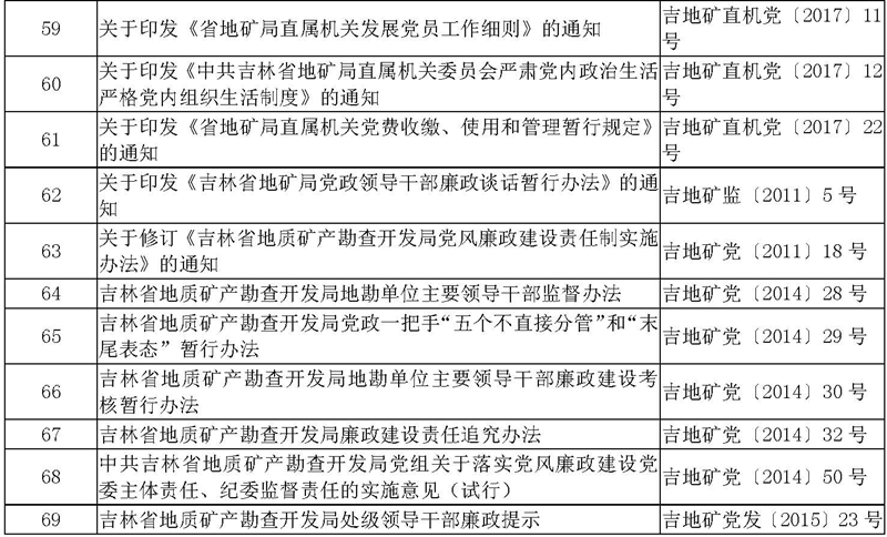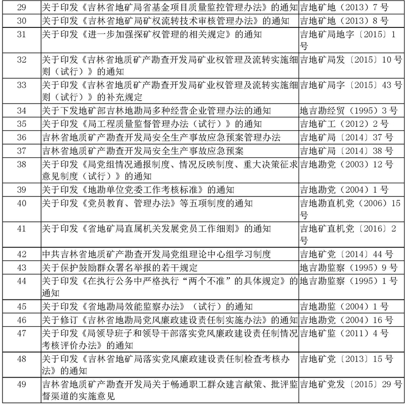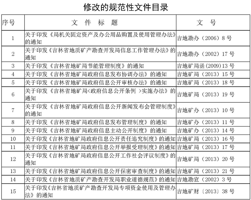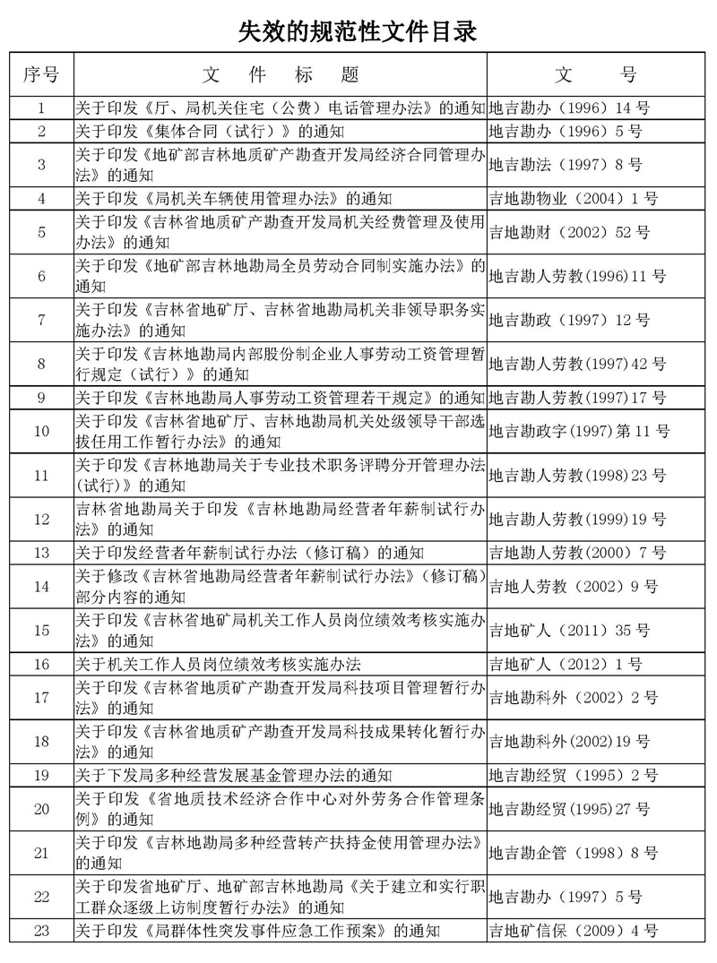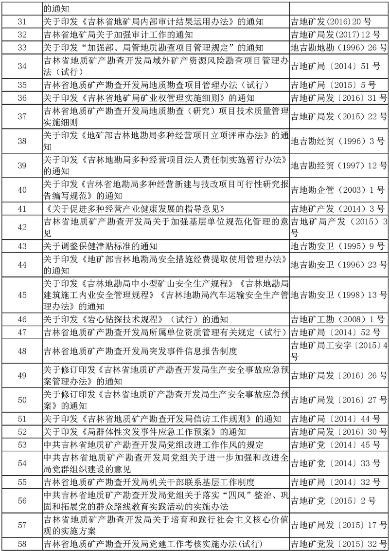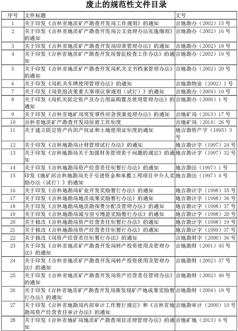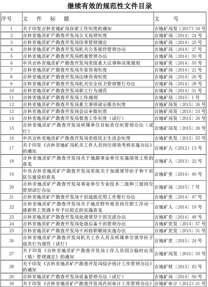 根据《吉林省人民政府办公厅关于开展规范性文件清理工作的通知》(吉政办明电【2017】14号)要求,吉林省地矿局对地矿部吉林地勘局成立至今(1995—2017年)所有规范性文件进行全面清理。经排查登记造册,共有156个规范性文件。对清理出的规范性文件逐件进行审查,并依据规范性文件处理原则作出了继续有效、修改、废止或者失效的处理决定。现将对继续有效、修改、废止和失效的规范性文件目录予以公布。